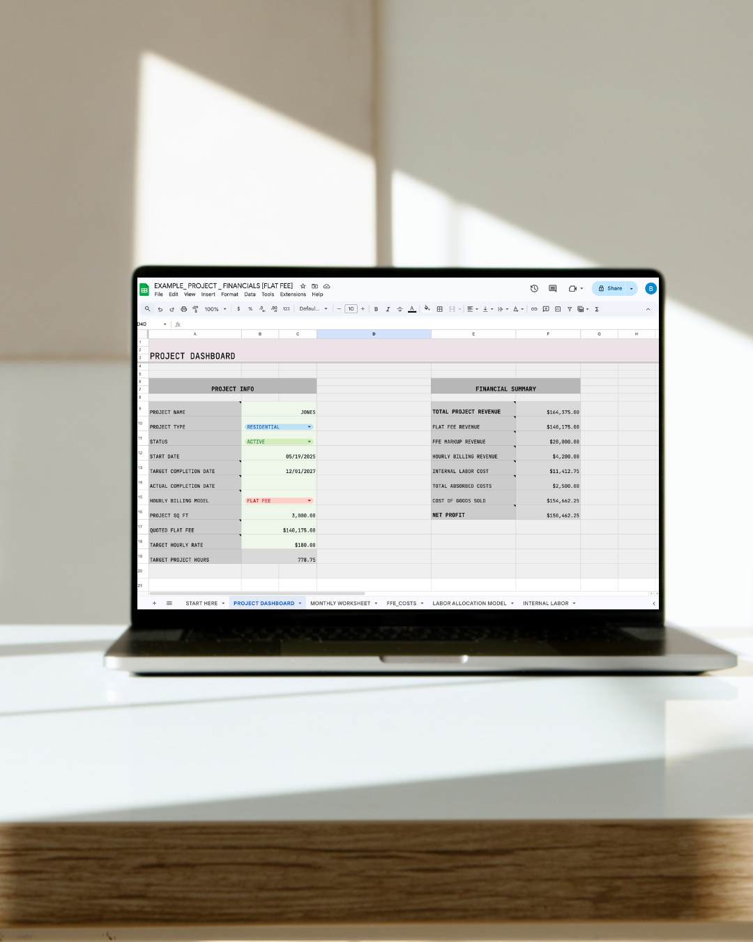 The Project Financial System is a structured spreadsheet that gives design principals a clear, real-time view of how a fixed-fee project is performing — financially, operationally, and over time.