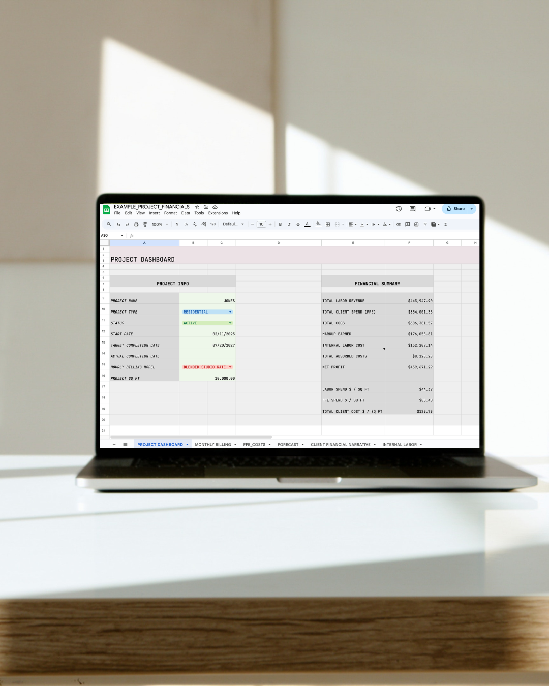 The Project Financial System is provided for use within a single design studio. Your purchase allows you to use and duplicate the spreadsheet internally across your own client projects. The spreadsheet may not be shared, distributed, published, or made available outside your studio in any form. This includes sharing the file, providing access to others, or reproducing any portion of the spreadsheet or its structure for external use. The Project Financial System is offered on a non-exclusive basis and may be licensed to other studios.